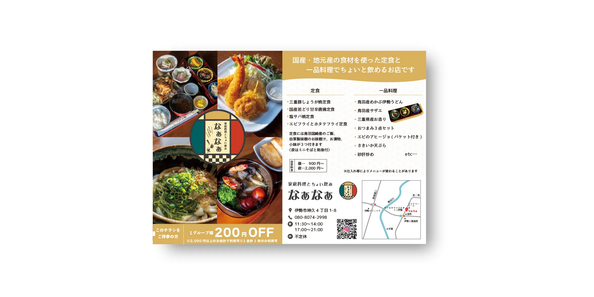 なぁなぁA5チラシ 2025 8/18 なぁなぁA5チラシ 伊勢にある家庭料理とちょい飲みのお店 なぁなぁさまのA5チラシを作成させていただきました。ほっとできる家庭料理が味わえるお店です。 なぁなぁさまInstagram design