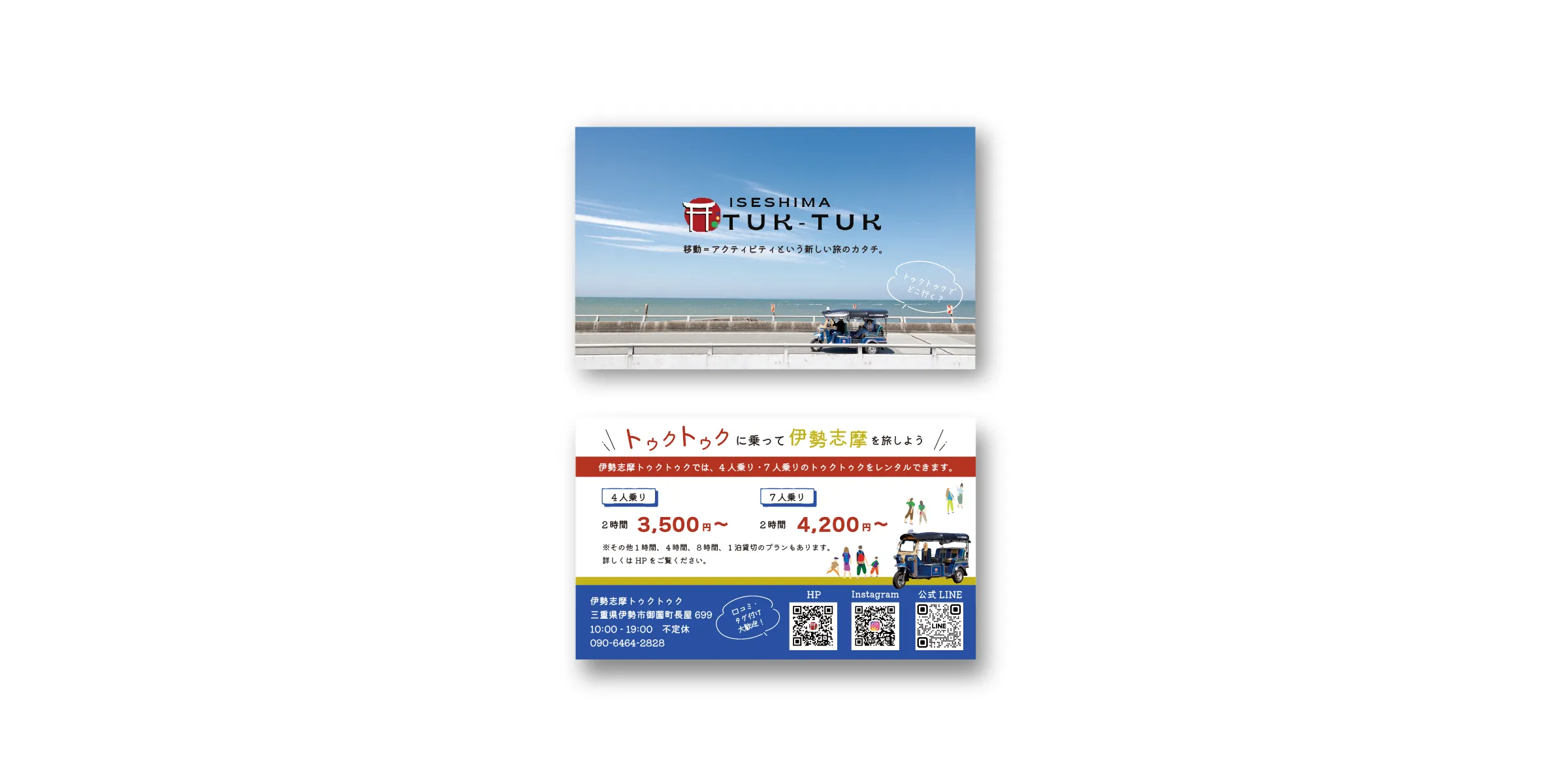 伊勢志摩トゥクトゥクショップカード 2025 8/18 伊勢志摩トゥクトゥクショップカード トゥクトゥクがレンタルできる伊勢志摩トゥクトゥクさまのショップカードを制作させていただきました。トゥクトゥクは普通自動車免許があれば誰でも乗ることができます。一味違う伊勢志摩観光が楽しめます。 伊勢志摩トゥクトゥク design